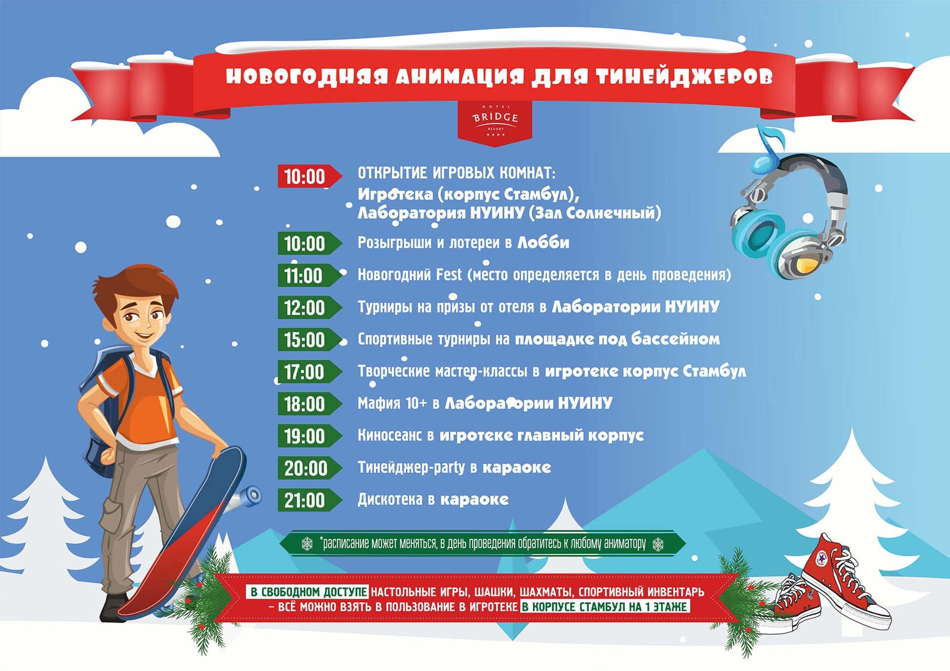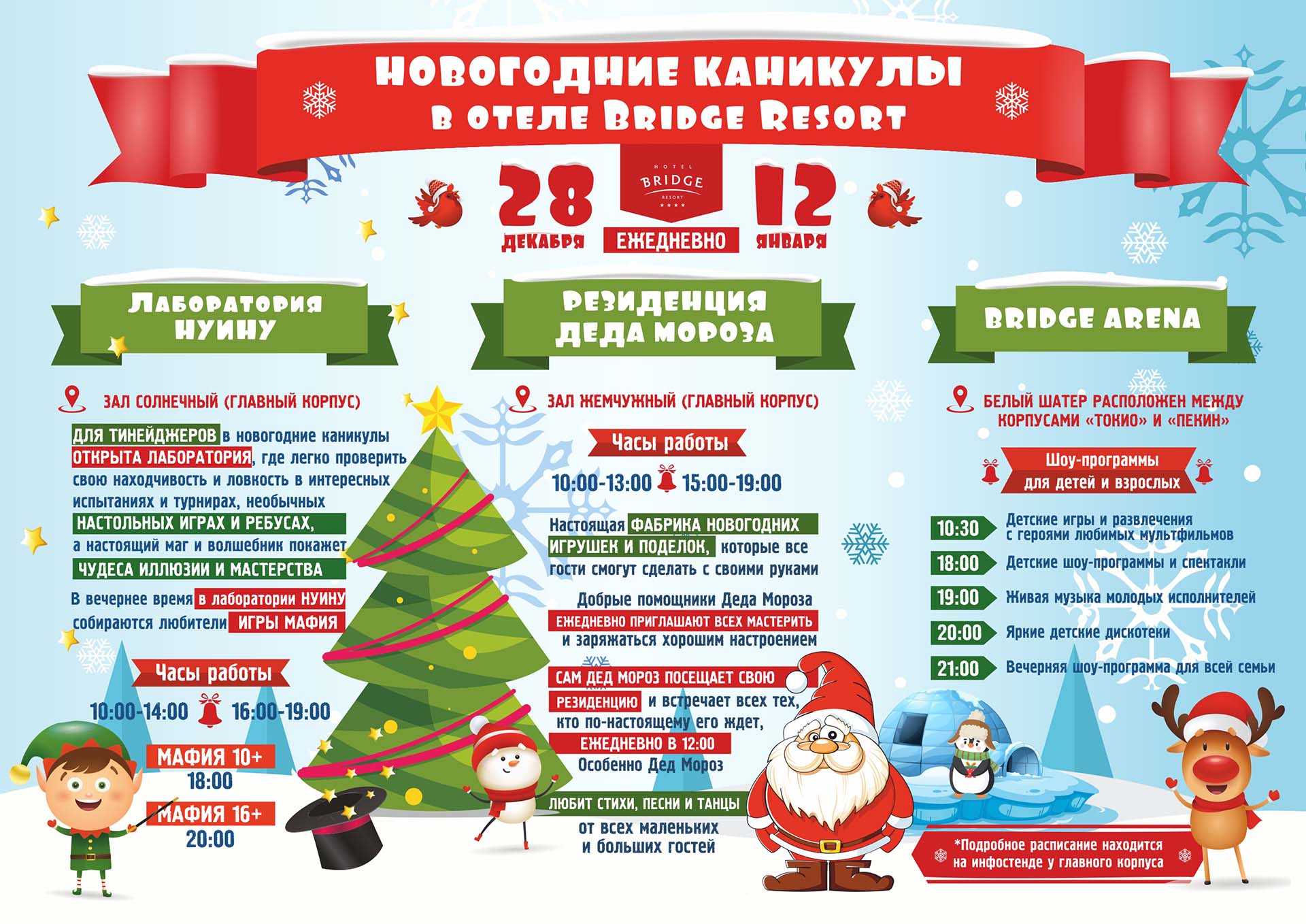 Новогодняя анимационная программа будет проходить ежедневно с 28 декабря по 12 января. С подробным расписанием можно ознакомиться внизу страницы.