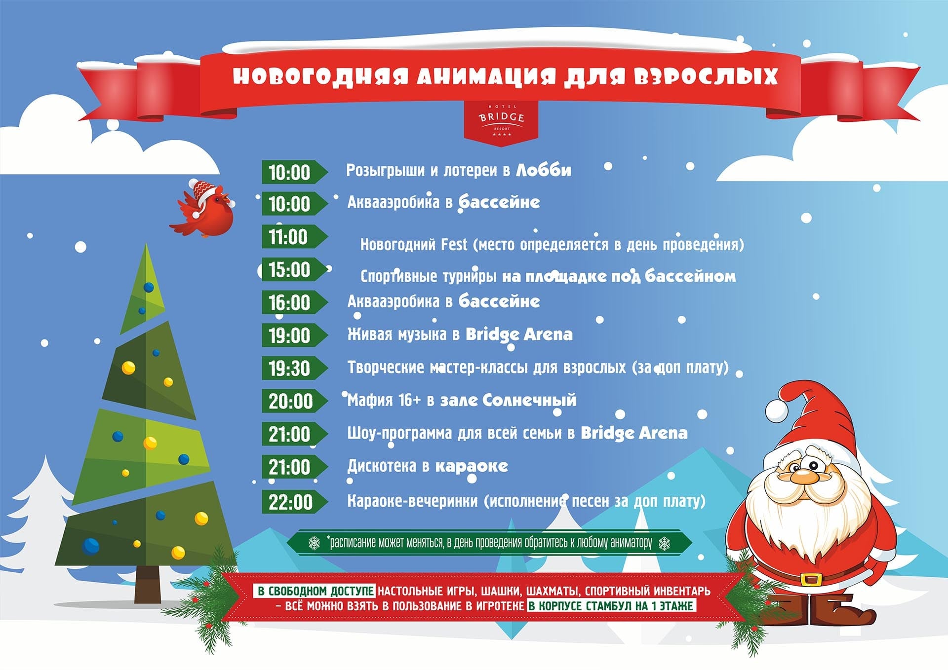 Новогодняя анимационная программа будет проходить ежедневно с 28 декабря по 12 января. С подробным расписанием можно ознакомиться внизу страницы.
